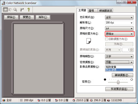 按一下[主視窗]標籤→選擇<原稿放置方向>的[原稿台]。