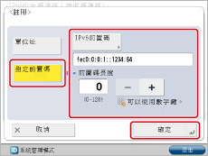 本節介紹如何僅允許IPv6前置碼位址為fec0:0:0:1::1234/64的電腦透過IPv6網路使用「遠端使用者介面」或應用程式軟體檢視和指定本機器的各項設定。