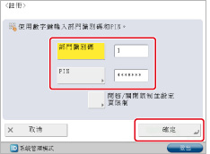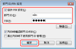 選擇[容許PIN設定]→輸入在步驟4中輸入的「部門識別碼」和PIN。