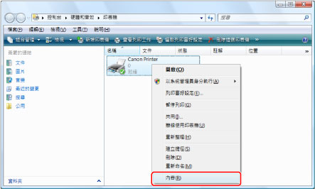 在[印表機]資料夾(或[印表機和傳真]資料夾)中,右鍵按一下要指定印表機設定的印表機的印表機圖示→按一下[內容]。