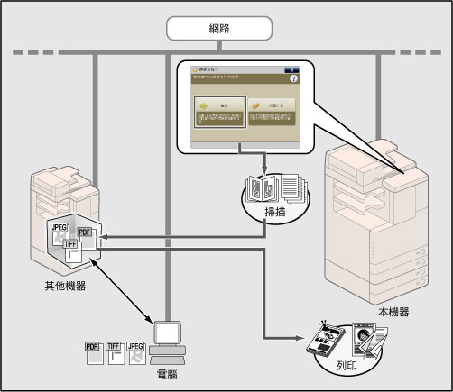 可以透過將使用本機器掃描的文件資料轉換為可在電腦上使用的檔案格式(PDF、JPEG或TIFF)來執行文件管理。