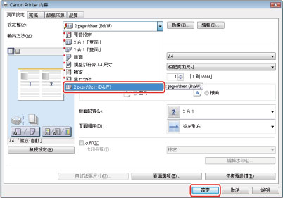 按<設定檔>下拉清單→選擇[2 pages/sheet (B&W)]→按一下[確定]。