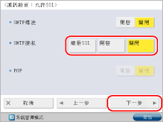 <使用POP接收>按[關閉]→<使用SMTP接收>按[開啟]→[下一步]。