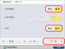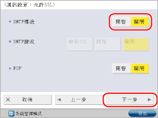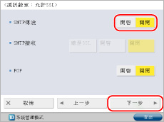 <使用POP接收>按[開啟]→<使用SMTP接收>按[關閉]→[下一步]。