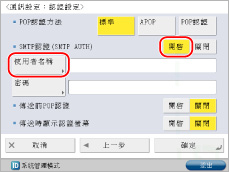 <SMTP認證(SMTP AUTH)>按[開啟]→[使用者名稱]。