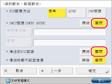 <SMTP認證(SMTP AUTH)>按[關閉]→<傳送前POP認證>按[關閉]。