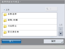 (設定/註冊)出現「設定/註冊」螢幕。利用「設定/註冊」螢幕,可以進行與本機器許多功能有關的一般設定並自訂特定功能,以滿足需要。有關設定的資訊,請參閱"設定/註冊螢幕操作流程."