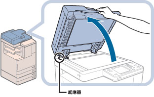 本機器的送稿機上具有開啟/關閉感應器(請參閱上圖中的圓形區域)。將原稿放在原稿台玻璃上時,請將送稿機抬起約300 mm,以便感應器與送稿機分離。若感應器未與送稿機分離,原稿尺寸可能不會被正確偵測。