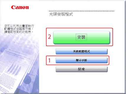 從「使用者軟體」光碟的功能表螢幕,可以開始安裝傳真驅動程式或顯示《傳真驅動程式安裝指南》。