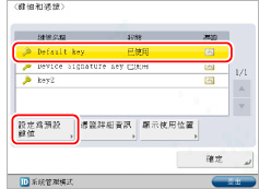 可以透過在「鍵值和憑證」螢幕上選擇鍵值對並按[憑證詳細資訊]檢查憑證的內容。在「憑證詳細資訊」螢幕上,可以按[憑證]核對憑證。