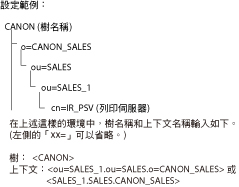 在[樹名稱]中,輸入所需列印伺服器所屬的樹狀結構的名稱→在[上下文名稱]中,輸入所需列印伺服器所屬的上下文的名稱→在[列印伺服器名稱]中,輸入所需列印伺服器的名稱。