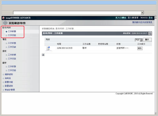 顯示包括「記憶接收收件匣」或「機密傳真收件匣」中的工作在內的本機列印工作日誌。