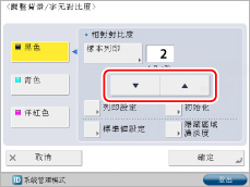 若增加[標準值設定]的數值,背景顏色變濃;若減少該數值,背景顏色變淡。選擇了[彩色背景上使用白色字母]時,若增加[標準值設定]的數值,文字顏色變濃;若減少該數值,文字顏色變淡。