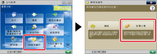 顯示記憶介質的預設設定為「關閉」。若要使用記憶介質,將「設定/註冊」的[參數選擇]中的[儲存位置顯示設定]設定為「開啟」。 (請參閱「儲存位置顯示設定」)