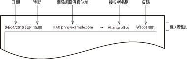 在本機器的「裝置資訊」設定中註冊的電子郵件位址將顯示在網際網路傳真接收者機器上的「寄件者」欄位中,而SSO-H的「本機裝置認證」使用者認證系統註冊的登入使用者的電子郵件位址將顯示在「傳送者」欄位中。