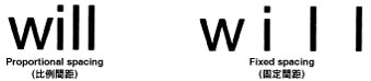每一種字型中每個字元的寬度以一個確定的點數表示,和其他字元各不相同。例如,字母「W」比字母「I」寬。有兩種方式列印不同寬度的字母︰不管字母實際寬度如何,以相同間距列印所有字母;或者變更字母間距以容納不同的字母寬度。以相同間距列印所有字母稱為「Fixed spacing」(固定間距),變更字母間距以容納不同的字母寬度稱為「Proportional spacing」(比例間距)。