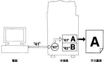 列印字母「A」時,主機將一個對應「A」的代碼(此範例中是一個十六進位數字41)傳送到本機器。此代碼稱為字元代碼。本機器在內部為每個字元都儲存有一個圖案,並從這些字元圖案中選擇與已接收代碼對應的圖案。因此,本機器搜尋代表「A」的圖案並列印該圖案。列印字母的過程。