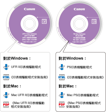 若有多個光碟,請使用以下資訊作為參考並選擇正確的光碟和印表機驅動程式。