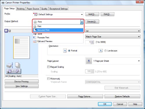 On the [Page Setup] sheet, press the <Output Method> drop-down list → select [Secured Print].