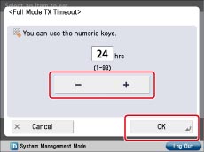 Press [-] or [+] to set the full mode TX timeout → press [OK].