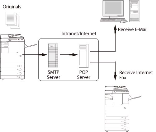 By using the Intranet Fax that uses office LAN for TCP/IP protocol for IP transmission instead of e-mail server, you can reduce the transmission cost. (If the intranet fax is used, the address is <name in alphanumeric characters@IP address>.) Also, if the intranet fax is used, data is received when send transmission is completed.