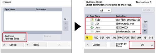 Press [Add from Address Book] → select three e-mail addresses that you want to store in the group → press [OK].
