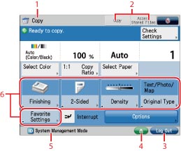 The progress of jobs and copy operations, and the status of devices and consumables are displayed here. Also, depending on the login service you are using, the Department ID or user name can be displayed.