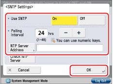 Press [SNTP Settings] for [TCP/IP Settings] → specify the following items → press [OK].