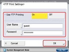 Press [FTP Print Settings] for [TCP/IP Settings] → specify the following items → press [OK].