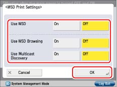 <Use WSD Browsing> is automatically set to 'On' if you set <Use WSD> to 'On', and enables information for the machine to be obtained using WSD.