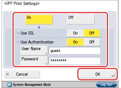 If you want to use the IPP authentication function, press [On] for <Use Authentication>. Press [User Name] → enter the user name to use for IPP authentication → press [OK]. Press [Password] → enter the password to use for IPP authentication → press [OK]. On the Confirm screen, enter the same password to confirm the password → press [OK].