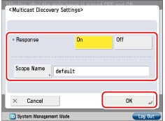 Press [On] for <Response> to use device information from other machines, such as an Address Book or Department ID Management settings, or respond to a multicast discovery from utilities.
