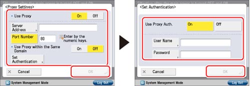 If you want to use proxy authentication, press [Set Authentication] → press [On] for <Use Proxy Auth.>. Press [User Name] → enter the user name to use for the proxy authentication → press [OK]. Press [Password] → enter the password to use for the proxy authentication → press [OK]. On the Confirm screen, enter the same password to confirm the password → press [OK].