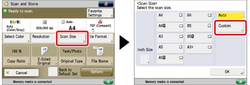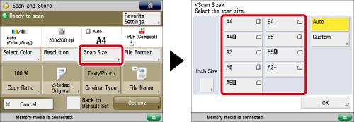 You can specify the scan size when using originals that cannot be scanned with [Auto] or when it is necessary to specify a particular size. You can also scan an A3 original with an image that extends all the way to the edges without the periphery of the original being cut off, and register specified sizes.