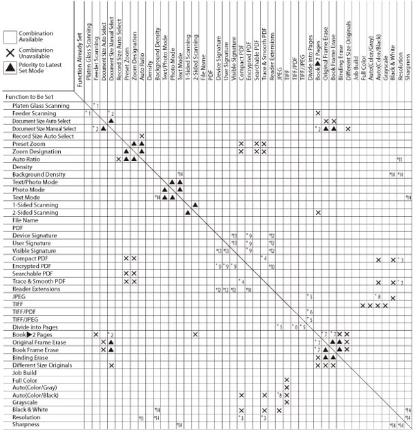 These charts show the available combinations of settings when you want to set more than one function at a time.
