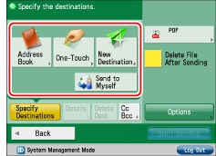 If you set [Limit New Destination] in [Function Settings] (Settings/Registration) to 'On' for a destination type, you cannot enter a new destination of that type in [New Destination]. Select a stored destination by using the Local Address Book, Remote Address Book, LDAP Server in [Address Book], or pressing a one touch button in [One-Touch] instead. (See "Restricting the Send Function.")