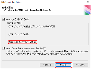 [実行する処理]で[既存ファクスドライバーの更新]を選択 → [次へ]をクリック
