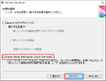 ドライバーの選択を解除 → [Canon Driver Information Assist Service]を選択 → [次へ]をクリック