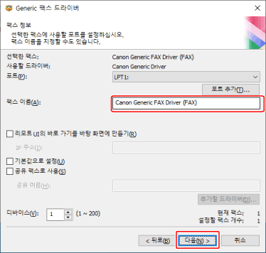 필요한 경우 [팩스 이름]을 변경 → [다음]을 클릭합니다.