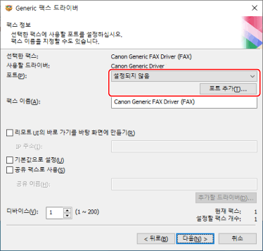 네트워크 프린터 포트를 선택한 경우 [팩스 이름] 및 [공유 팩스로 사용]을 설정할 수 없습니다.