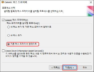 [팩스 드라이버를 설치할 프로세스]로 [기존 팩스 드라이버 업데이트]를 선택 → [다음]을 클릭합니다.
