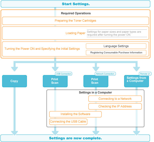 To use the functions of the machine (Copy, Print, Scan, Remote UI), set your machine as follows.