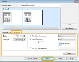 If you want to edit the print settings of the combined file, click [Print Settings] -> specify the desired settings -> click [Combine].