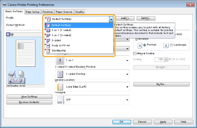 Combinations of printer driver settings corresponding to a variety of printing purposes are provided with the printer driver as "profiles." This enables you to print documents according to a desired objective by simply selecting a profile from the [Profile] list.