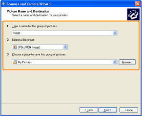 For details, see the step 6 to step 14 in "Scanning from the [Scanner and Camera Wizard] dialog box (Windows XP only)."
