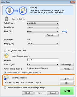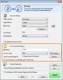 When [Start] is clicked, the [ScanGear MF] dialog box appears and enables you to make advanced settings for scanning.