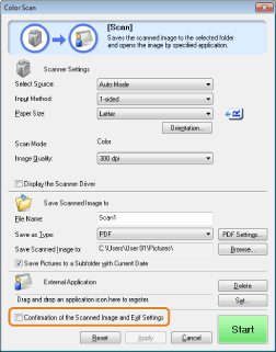 Select the [Confirmation of the Scanned Image and Exif Settings] ([Confirm the Scanned Image] for the [PDF] button) check box.