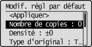 Les valeurs par défaut utilisées pour la copie correspondent à la fonction appliquée lorsque la machine est mise sous tension, lorsque vous appuyez sur [