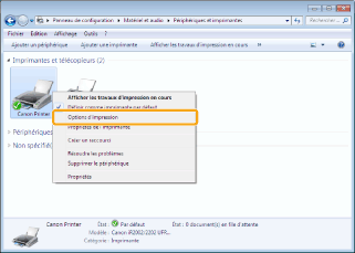 Cliquez avec le bouton droit sur l'icône de la machine -> cliquez sur [Options d'impression] (ou [Préférences d'impression]).