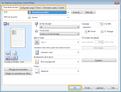 Configurez les réglages requis dans l'écran du pilote d'imprimante -> cliquez sur [OK].